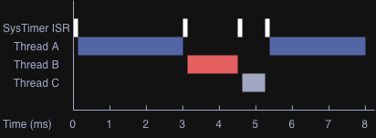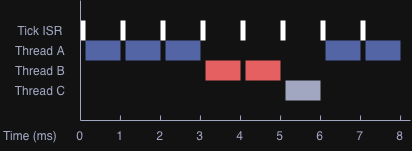 The kernel uses preemptive priority-based scheduling, a scheduling algorithm designed to allocate processing time among threads based on their priority level, where a higher value represents higher priority.