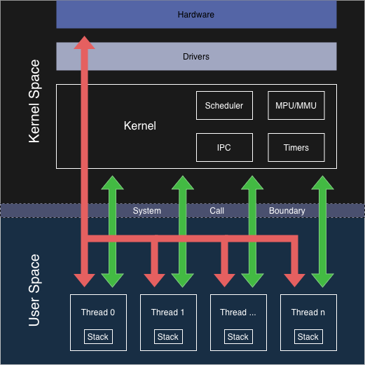 ARM Cortex-M processors implement Process Stack Pointer (PSP) and Main Stack Pointer (MSP) to facilitate stack separation. Threads (including idle thread) operate using PSP, while the kernel and ISRs utilize MSP.
